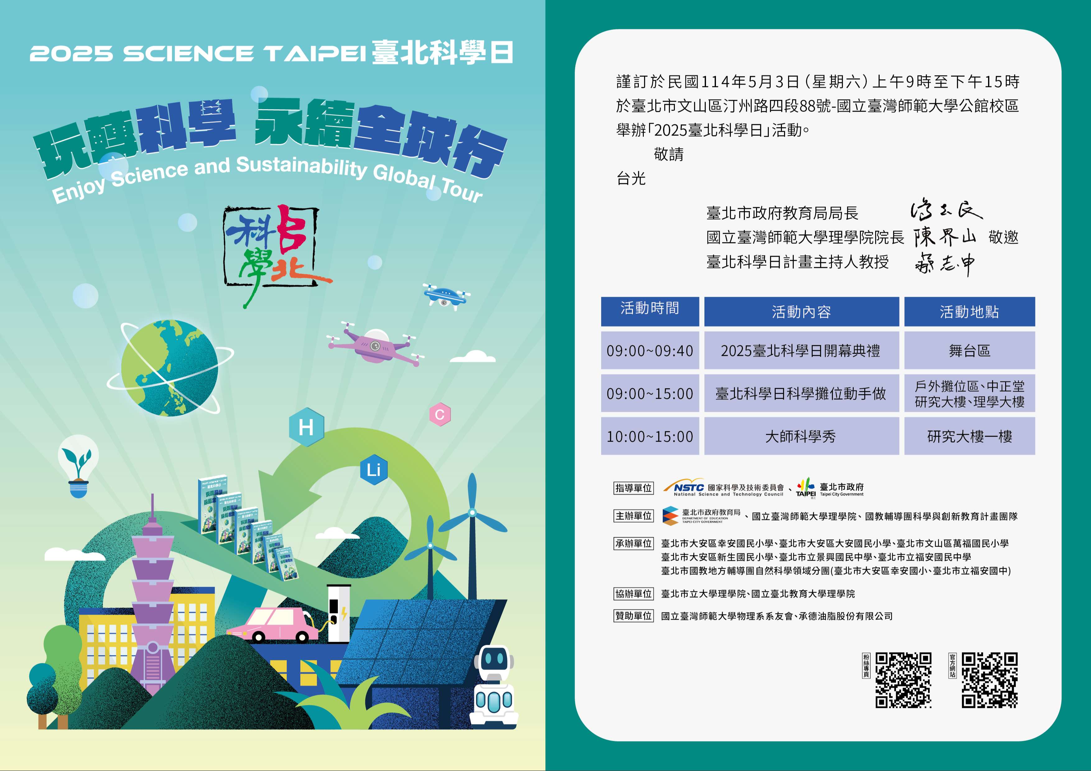 二、旨案係由本局與國立臺灣師範大學理學院物理學系合作舉辦,本年度將於114年5月3日(星期六)假師大公館校區辦理科學體驗實作活動,並響應聯合國教育科學及文化組織「永續發展國際十年(IDSSD)」理念,藉本活動「玩轉科學-永續全球行」之主題,彰顯本市對於推動科學教育的重視。