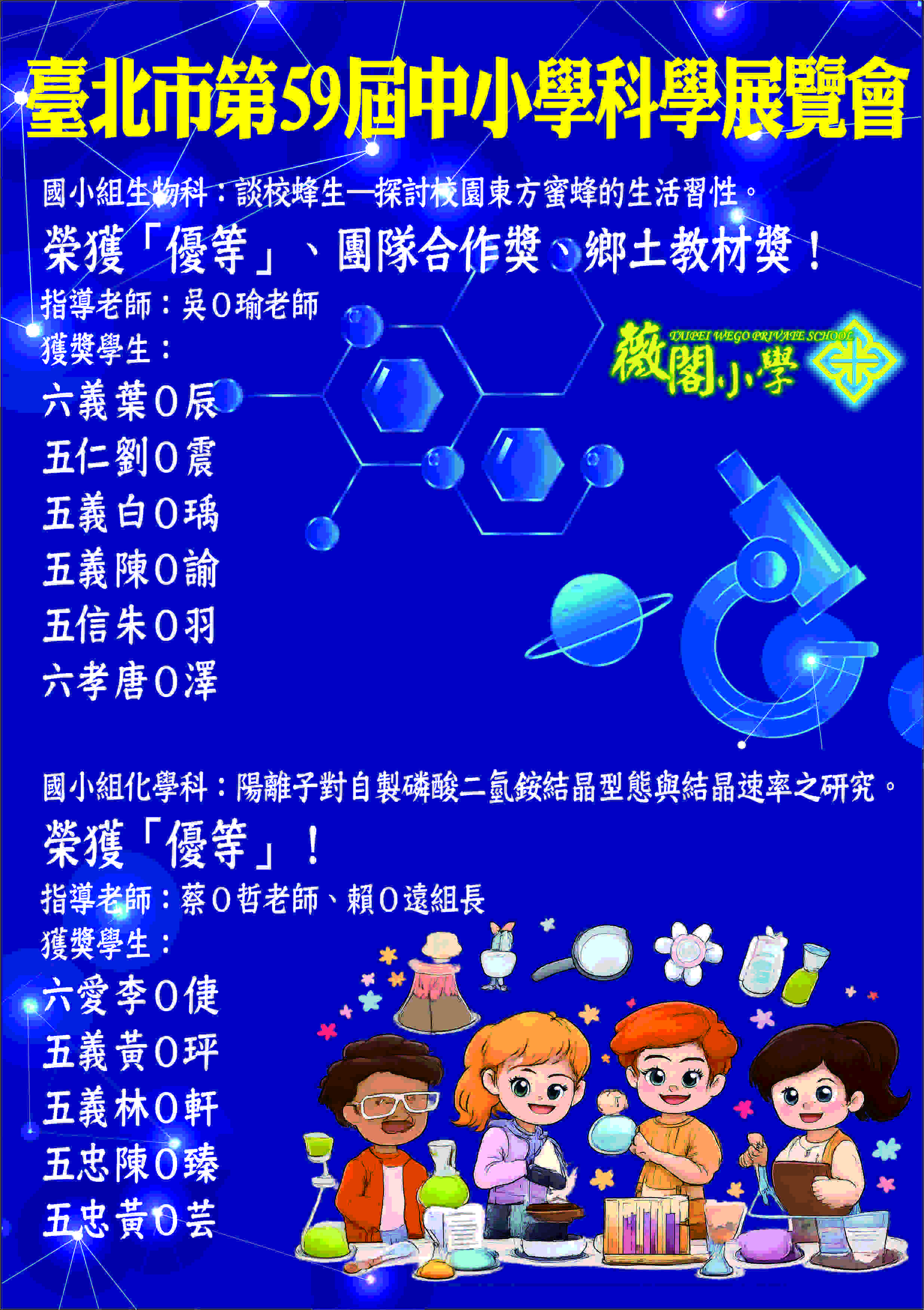 !!!!狂賀!!!! 臺北市第59屆中小學科學展覽會 榮獲「優等」、團隊合作獎、鄉土教材獎! 指導老師:吳O瑜老師 獲獎學生: 六義 葉O辰 五仁 劉O震 五義 白O瑀 五義 陳O諭 五信 朱O羽 六孝 唐O澤 國小組化學科:陽離子對自製磷酸二氫銨結晶型態與結晶速率之研究。 榮獲「優等」! 指導老師:蔡O哲老師、賴O遠組長 獲獎學生: 六愛 李O倢 五義 黃O玶 五義 林O軒 五忠 陳O臻